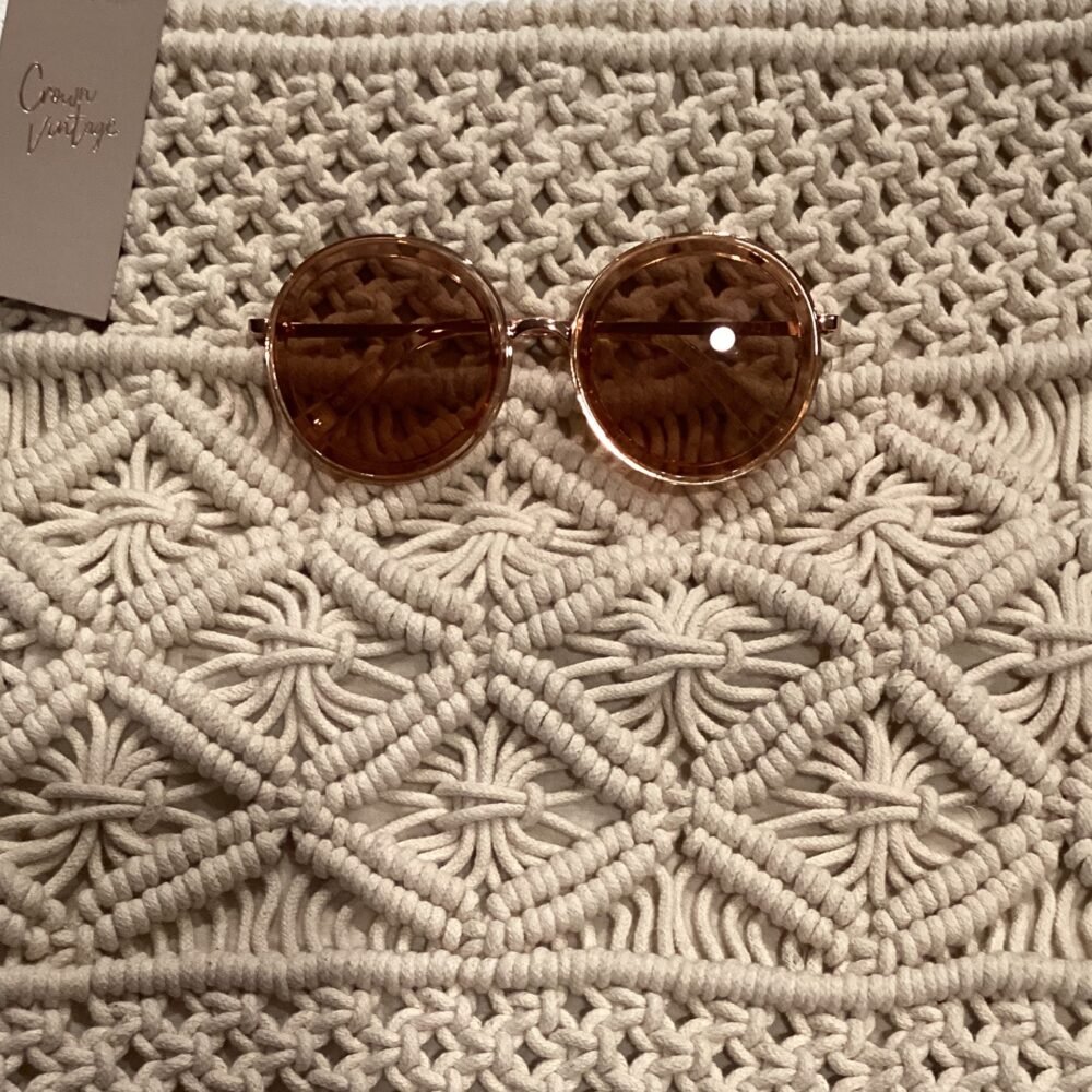 Tan crochet with fringe crossbody with rose gold round sunglasses