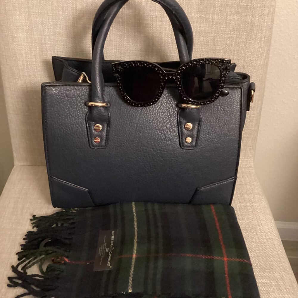 Navy purse, black sunglasses, multicolor scarf