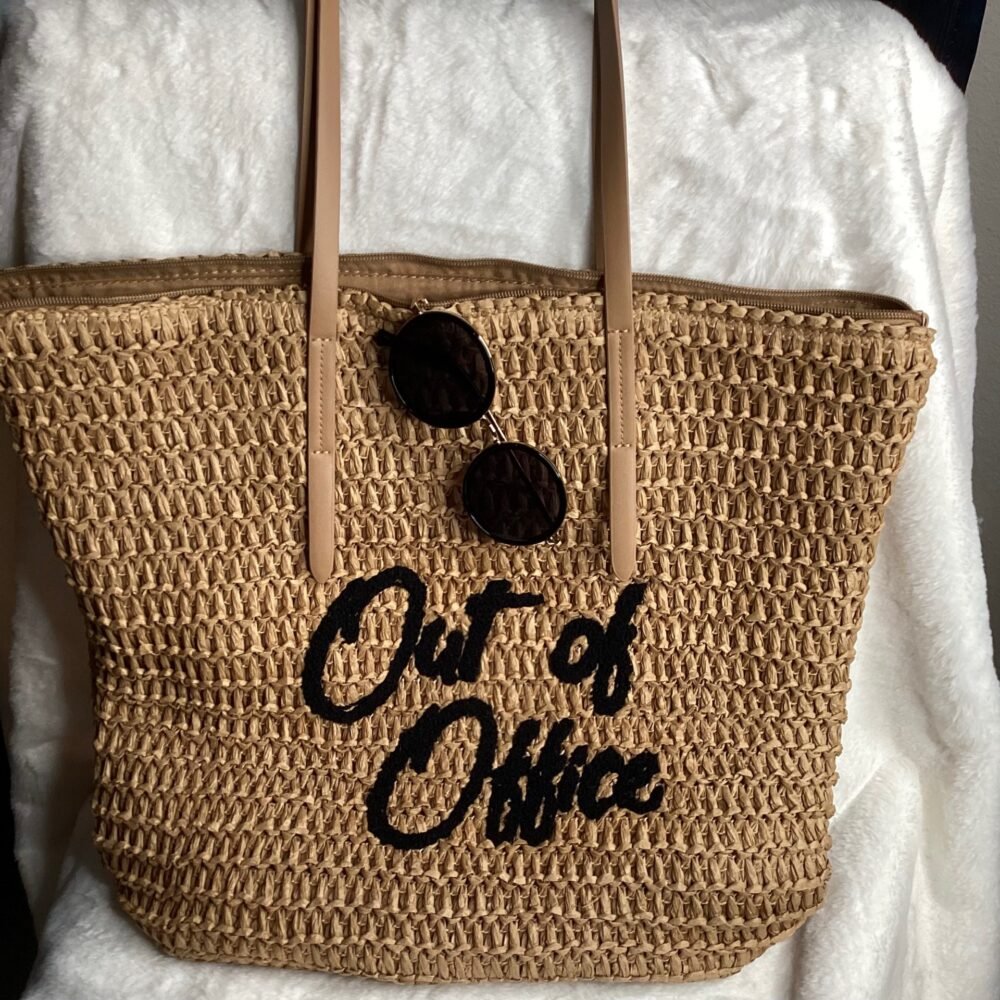 Out of Office straw bag with sunglasses and diary