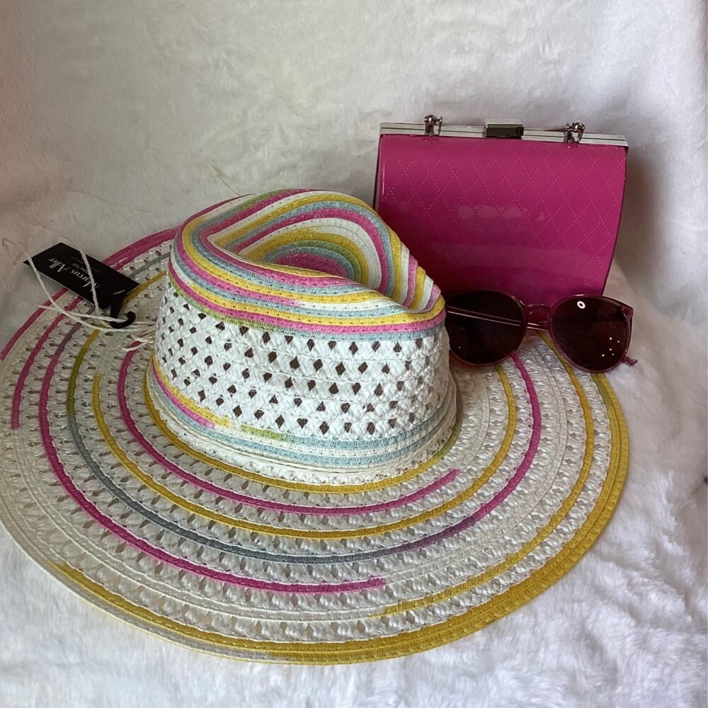 Be the first to review “Pink clutch with striped hat and sunglasses”