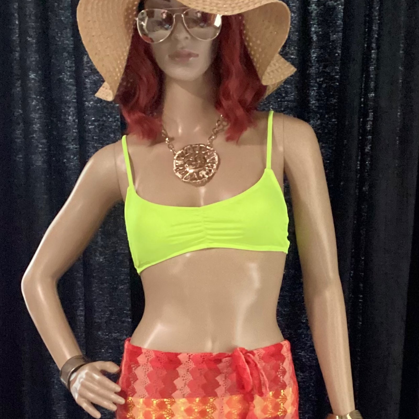 Red and coral beach pants (medium) with hat and sunglasses