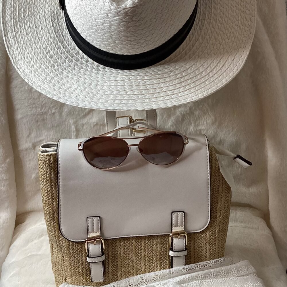 White backpack with sunglasses